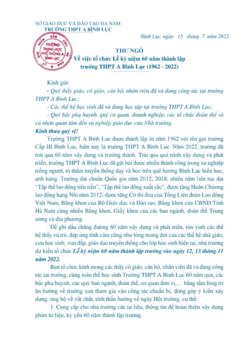 THƯ NGỎ về việc tổ chức Lễ kỷ niệm 60 năm thành lập trường THPT A Bình Lục (1962-2022)